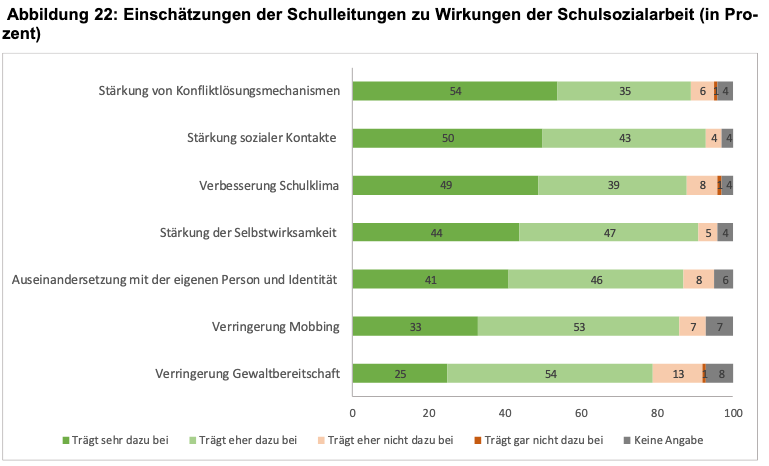 Schulen, die schon lan­ge eine Schulsozialarbeiterin haben, berich­ten posi­ti­ve Effekte. Exemplarisch kön­nen die Ergebnisse der „Prozessbegleitenden Evaluierung des Landesprogramms Schulsozialarbeit“ aus dem Jahr 2020 angeführt werden: