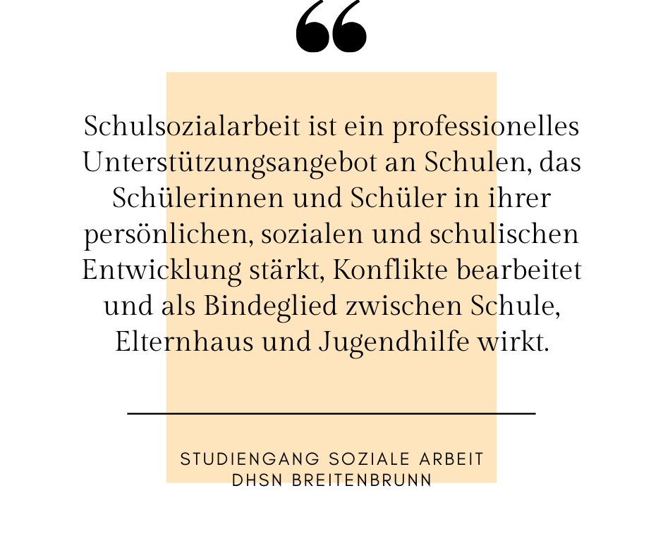 Schulsozialarbeit ist ein pro­fes­sio­nel­les Unterstützungsangebot an Schulen, das Schülerinnen und Schüler in ihrer per­sön­li­chen, sozia­len und schu­li­schen Entwicklung stärkt, Konflikte bear­bei­tet und als Bindeglied zwi­schen Schule, Elternhaus und Jugendhilfe wirkt.