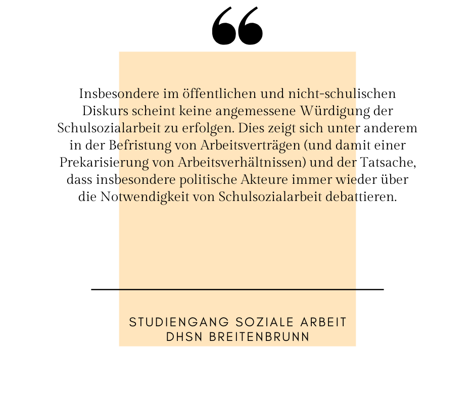 In Bezug auf Frage 5 ist davon aus­zu­ge­hen, dass die Schulen selbst Schulsozialarbeit ange­mes­sen würdigen. Insbesondere im öffent­li­chen und nicht-schu­li­schen Diskurs scheint jedoch kei­ne ange­mes­se­ne Würdigung zu erfol­gen. Dies zeigt sich unter ande­rem in der Befristung von Arbeitsverträgen (und damit einer Prekarisierung von Arbeitsverhältnissen) und der Tatsache, dass ins­be­son­de­re poli­ti­sche Akteure immer wie­der über die Notwendigkeit von Schulsozialarbeit debattieren.